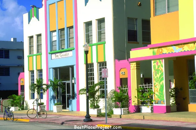 This hotel, located in the heart of South Beach, is surrounded by pastel-colored buildings with complex patterns that exemplify Art Deco architecture.