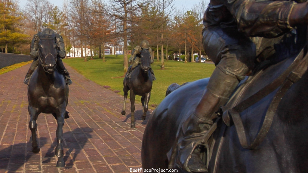 The dynamic racing scene sculpture, which beautifully reflects the grace and excitement of horse racing, is the park’s main draw.