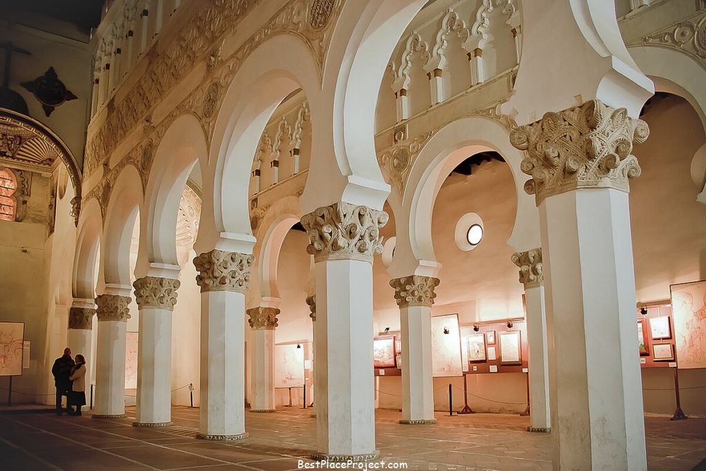 The interior features a remarkable Mudejar ceiling and lovely frescoes. The surviving mihrab, a niche that points in the direction of Mecca and is Toledo’s main point of interest, is a tribute to the city’s rich, interwoven past with many cultures and religions.