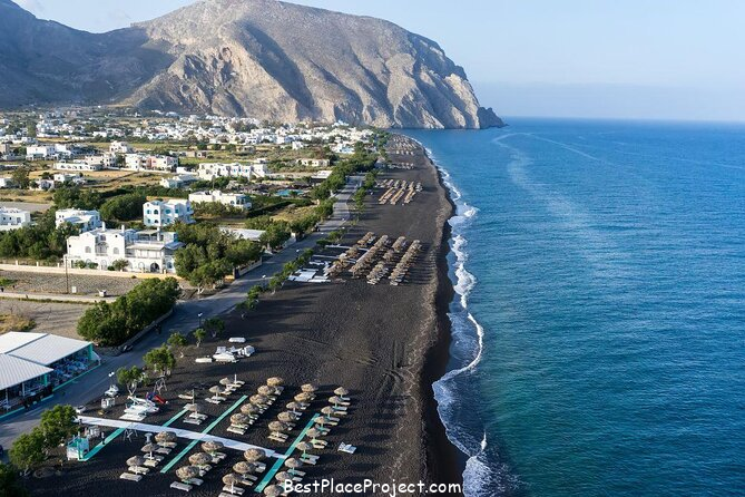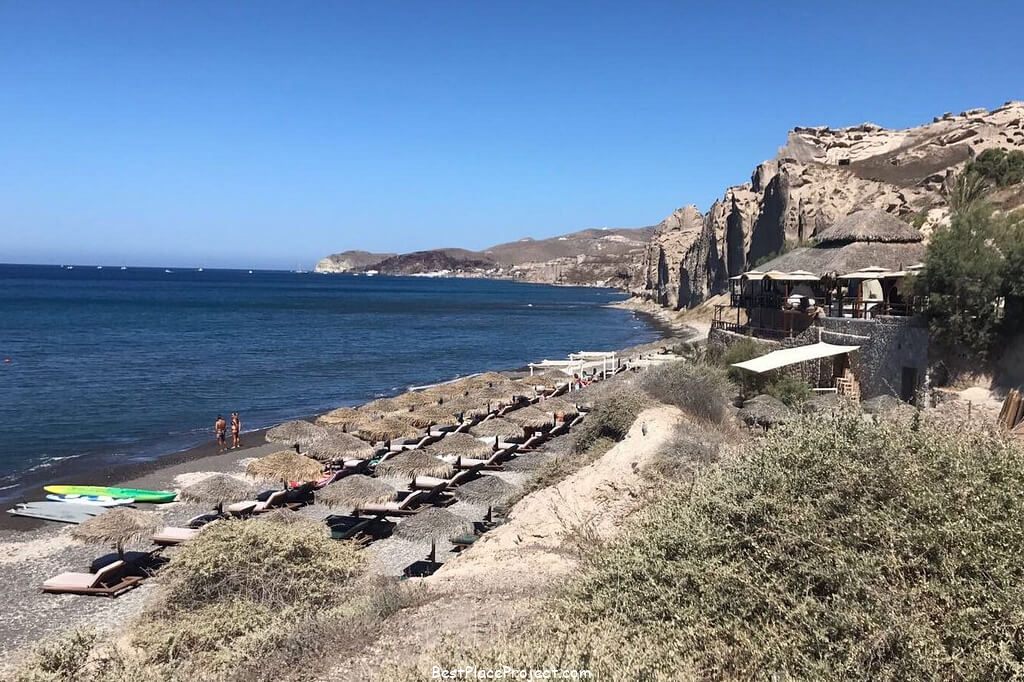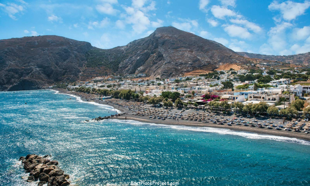 The nearest beach to Santorini Airport is Kamari Beach, which is a family-friendly destination with a variety of activities. Perhaps the most developed and, for lack of a better term, “touristy” village on Santorini is the one behind the black beach. As a result, there are many dining and drinking options as well as a wide selection of cozy accommodations. There are playgrounds, a miniature golf course, and Ancient Thera nearby. If you plan to go for a walk, make sure to pack a decent pair of sandals because the beach itself is very rocky. There are periodically planes flying parallel to the shore when they make their final approach because it’s just south of the airport, but they don’t create a lot of noise.