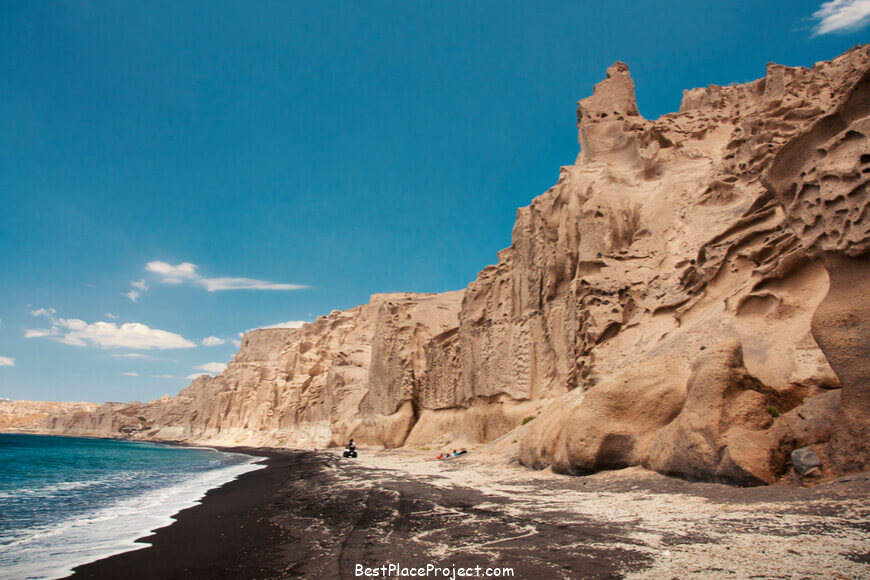 Monolithos Beach, which lies just east of Santorini Airport, is possibly the island’s sandiest beach—or, at the very least, the one with the fewest pebbles. It is a rather peaceful spot that’s usually visited by local families, even though it’s only a short drive from Kamari. Instead of having the sudden drop-off that characterizes many other Santorini beaches, the seafloor gently slopes away from the island. The southern end of the beach has a small harbor for fishing boats, and behind it is a few hotels and tavernas. Monolithos Beach offers some of the best kite-surfing if you want extreme water sports.
