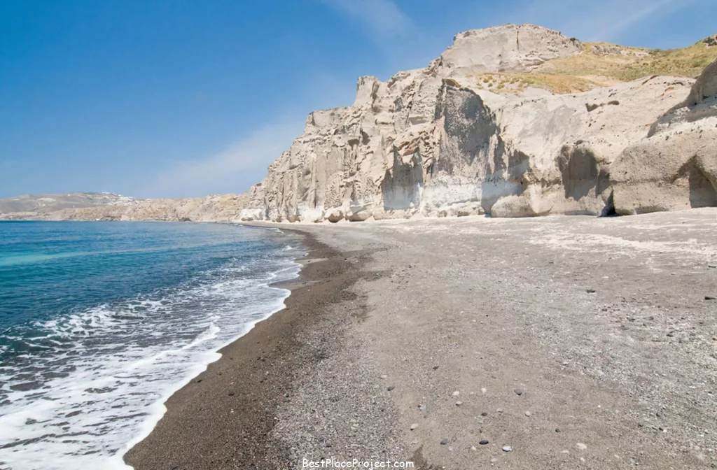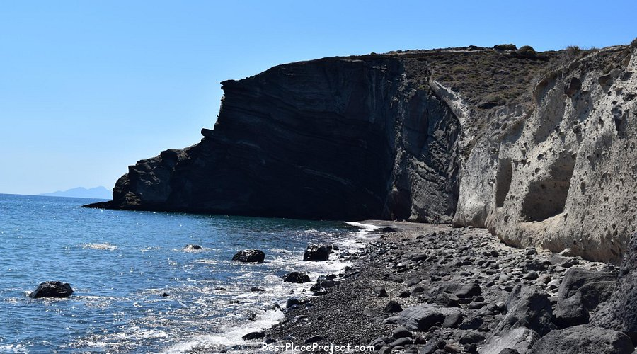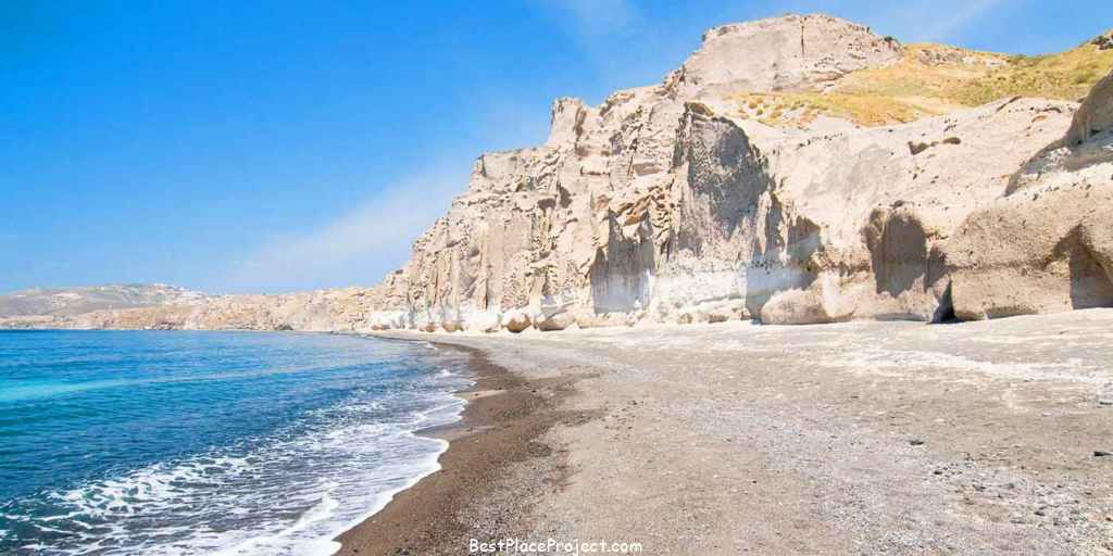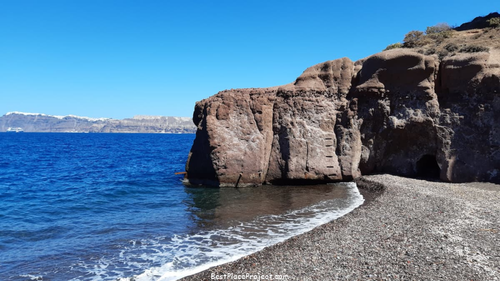 As the name suggests, Caldera Beach, which faces the caldera, is about the only beach on Santorini’s west side that is worth seeing. It is also called Balos Beach and is reached by a very careful drive up a twisting, unpaved road north of Akrotiri. It features a few peaceful taverns, a dark, pebbly beach, and a lovely view of the well-known cliffs of Santorini. It is not well known, is typically quite quiet and private, and is rather far away and difficult to get to.
