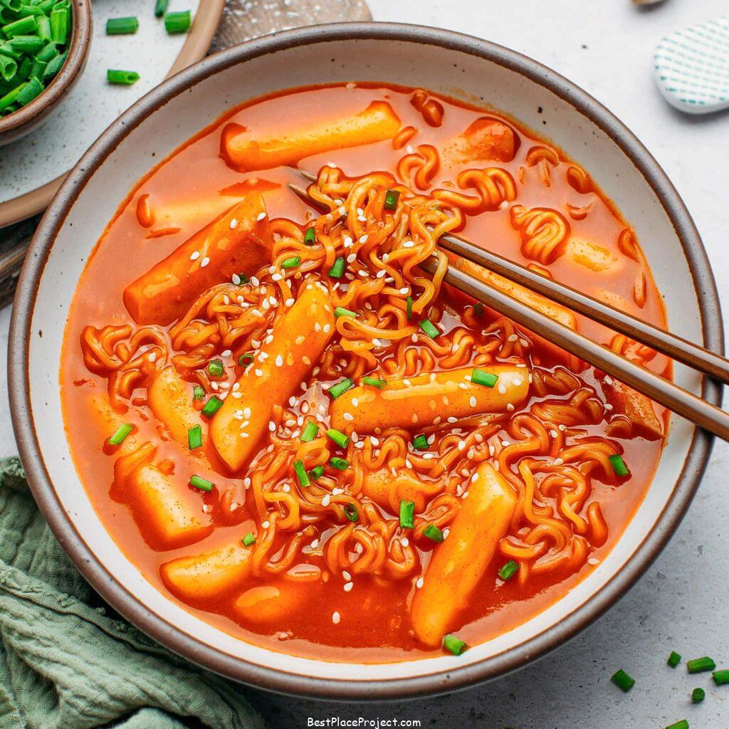 You can even add Tteokbokki as a topping on your ramen with some mozzarella cheese, cabbage, onions and many other vegetables.