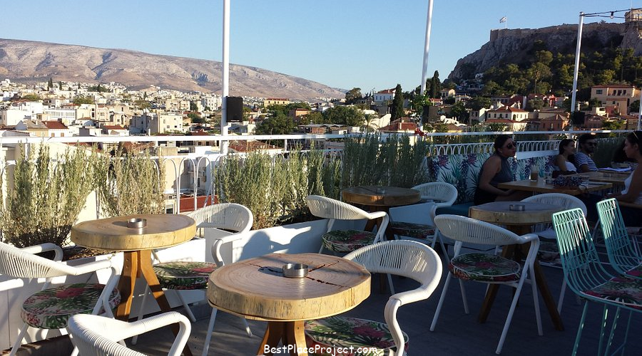 Loukoumi Bar is different from other rooftop bars, as it’s more a coffee bar than a traditional cocktail lounge, with retro, mismatched and eclectic décor. The lighting is provided by distinctly retro lamps shaped like planets, and the view places the Parthenon and the Observatory front and centre, so you’ll feel like you’re launched into outer space while here. Every evening you’ll see live music and theatrical performances. During the day, you can catch art installations, play chess and enjoy good food at reasonable prices. This place gets crowded in the evenings. While reservations aren’t necessary, getting here early is a good idea. It’s right in the city centre.