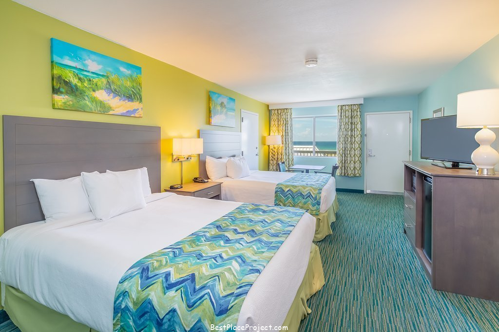 The hotel also offers modern amenities, including a beachfront pool, complimentary hot breakfast, and easy access to the beach.